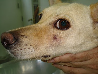 Abaixo estão as fotos da Suzi, uma SRD que veio ao consultório com um aumento de volume em região de face esquerda, seguida de secreção local (Foto 1). Ao avaliarmos a cavidade oral, notamos uma fratura dentária (4o pré molar esquerdo), no RX de crânio haviam áreas de lise óssea. No caso dela optamos pela exodontia. Em 5 dias de pós operatório quase já não havia secreção através da fístula, estava comendo bem e clinicamente sem alterações