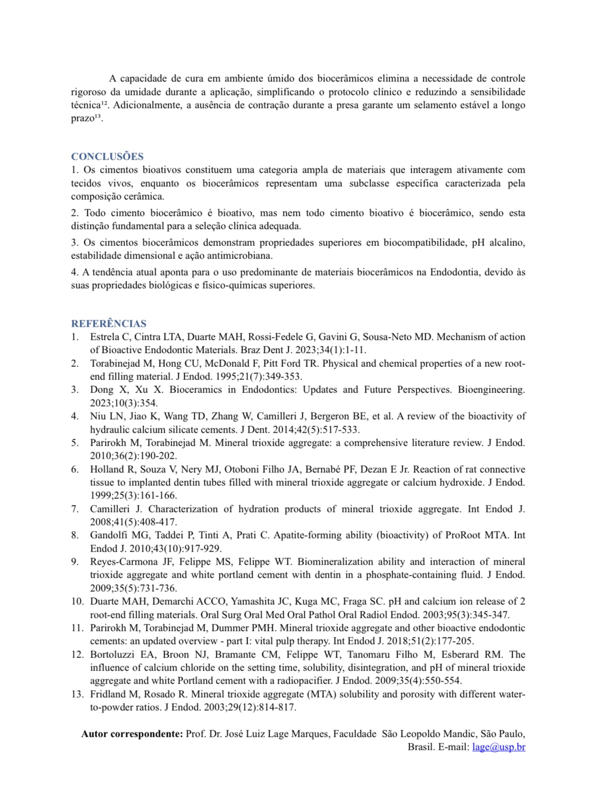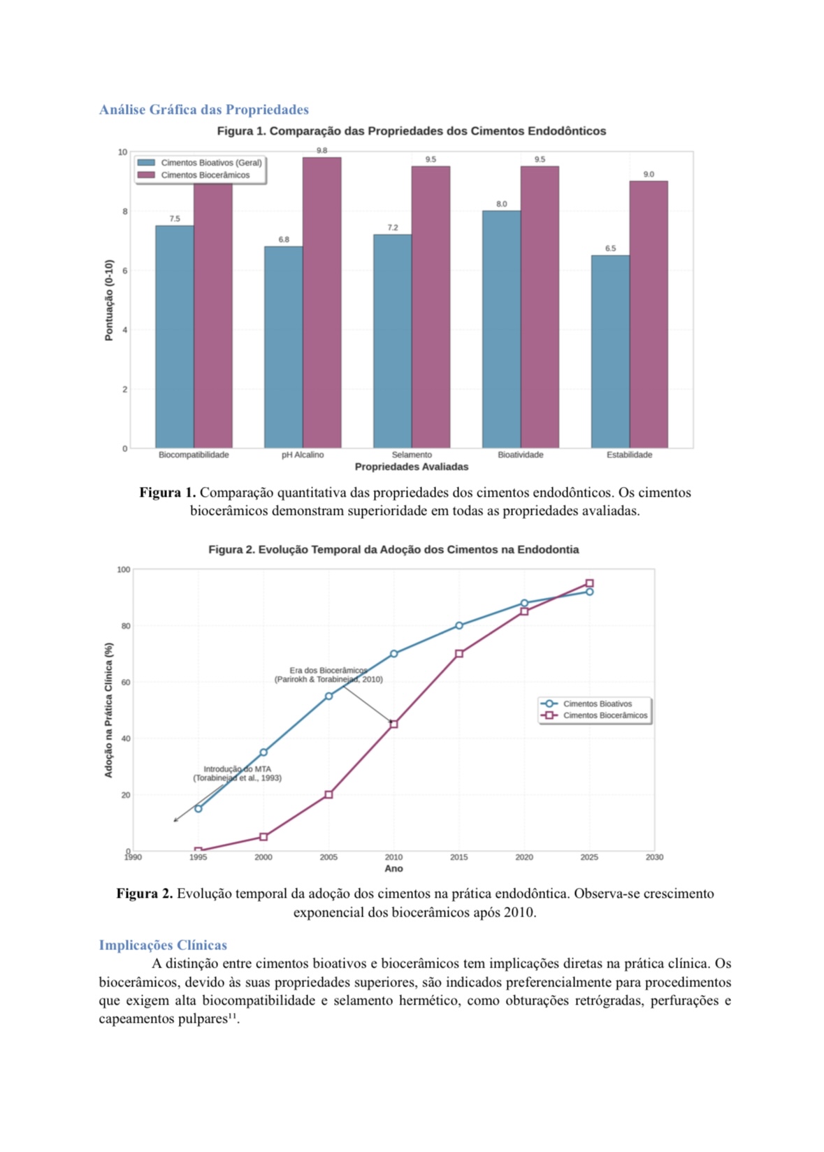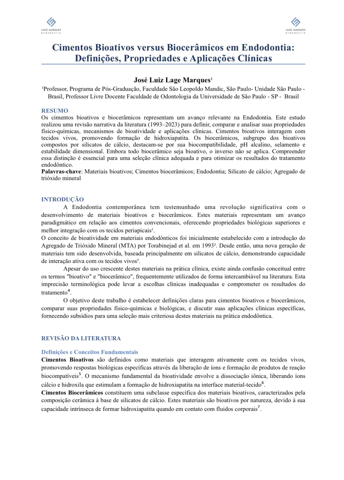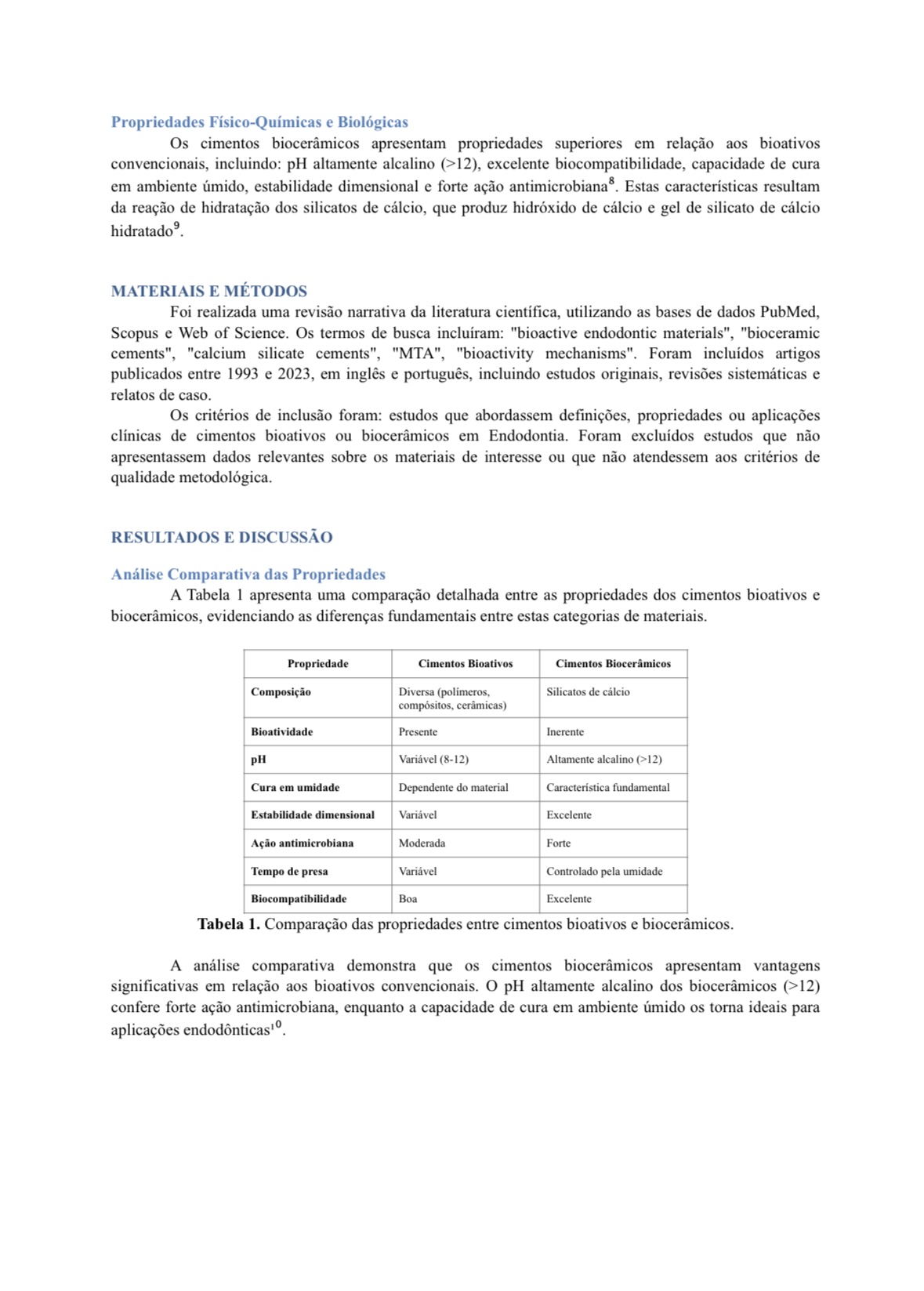 Este estudo realizou uma revisão narrativa da literatura (1993-2023) para definir, comparar e analisar os Cimentos Bioativos e Biocerâmicos, suas propriedades físico-químicas, mecanismos e aplicações clínicas.